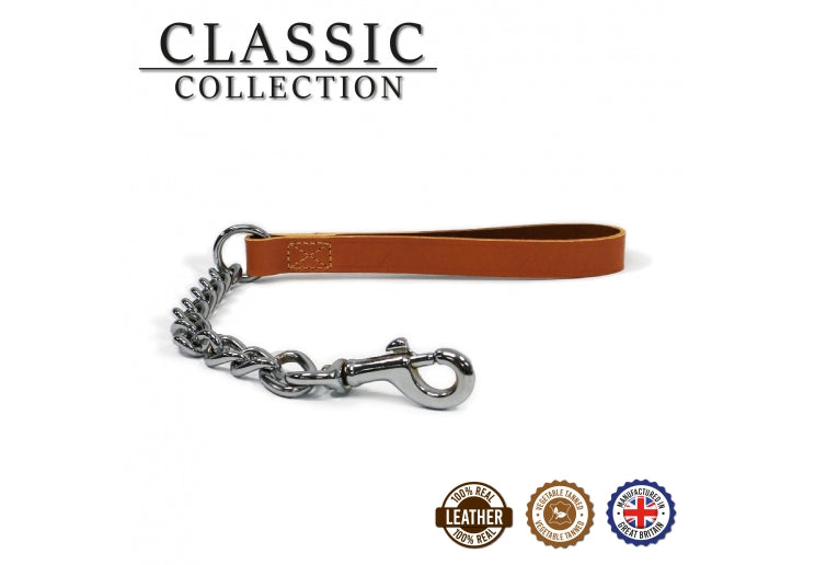 Produced by our skilled workforce in the UK-Made with the finest quality European bridle leather for strength-Chrome-plated welded steel for strength-Clean and unfussy design-Available in black tan and red-Matching Heritage leather collars available-Please note that leather is a natural porous product. If the leather becomes wet some colour run of the natural dye may happen. Leather leads ought not be saturated with water. If the lead becomes saturated allow it to air-dry naturally and do not use heat to speed the drying process. To keep the item in tip-top shape we recommend treating with a leather conditioner annually.-Available in 6 sizes (87cm fine chain max weight 20kg. 80cm medium chain max weight 30kg. 80cm heavy chain max max weight 50kg. 90cm heavy chain max weight 50kg. 50cm extra- heavy chain max weight 75kg. 80cm extra-heavy chain max weight 75kg).-We are committed to reducing our packaging and using recycled and recyclable packaging. This item is supplied on packg that is widely recycled.
