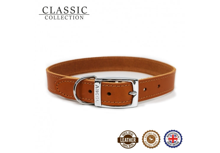 Produced by our skilled workforce in the UK-Made with the finest quality European bridle leather for strength-Clean and unfussy design-Available in black tan and red-Matching Classic leather leads available-Please note that leather is a natural porous product. If the leather becomes wet some colour run of the natural dye may happen. Leather collars ought not be saturated with water. If the collar becomes saturated allow it to air-dry naturally and do not use heat to speed the drying process. To keep the item in tip-top shape we recommend treating with a leather conditioner annually.-Available in sizes 1-8 (Size 1 fits 20-26cm Size 2 fits 26-31cm Size 3 fits 28-36cm Size 4 fits 35-43cm Size 5 fits 39-48cm Size 6 fits 45-54cm Size 7 fits 50-59cm Size 8 fits 55-63cm)-We are committed to reducing our packaging and using recycled and recyclable packaging. This item is supplied on packaging that is widely recycled.