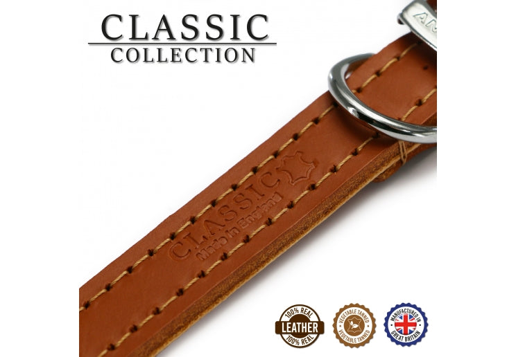 Produced by our skilled workforce in the UK-Made with the finest quality European bridle leather for strength-Clean and unfussy design-Available in black tan and red-Matching Classic leather leads available-Please note that leather is a natural porous product. If the leather becomes wet some colour run of the natural dye may happen. Leather collars ought not be saturated with water. If the collar becomes saturated allow it to air-dry naturally and do not use heat to speed the drying process. To keep the item in tip-top shape we recommend treating with a leather conditioner annually.-Available in sizes 1-8 (Size 1 fits 20-26cm Size 2 fits 26-31cm Size 3 fits 28-36cm Size 4 fits 35-43cm Size 5 fits 39-48cm Size 6 fits 45-54cm Size 7 fits 50-59cm Size 8 fits 55-63cm)-We are committed to reducing our packaging and using recycled and recyclable packaging. This item is supplied on packaging that is widely recycled.