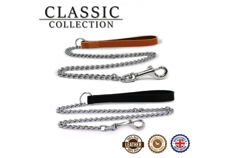 Produced by our skilled workforce in the UK-Made with the finest quality European bridle leather for strength- Chrome-plated welded steel for strength-Clean and unfussy design-Available in black tan and red-Matching Heritage leather collars available-Please note that leather is a natural porous product. If the leather becomes wet some colour run of the natural dye may happen. Leather leads ought not be saturated with water. If the lead becomes saturated allow it to air-dry naturally and do not use heat to speed the drying process. To keep the item in tip-top shape we recommend treating with a leather conditioner annually.-Available in 6 sizes (87cm fine chain max weight 20kg. 80cm medium chain max weight 30kg. 80cm heavy chain max max weight 50kg. 90cm heavy chain max weight 50kg. 50cm extra- heavy chain max weight 75kg. 80cm extra-heavy chain max weight 75kg).-We are committed to reducing our packaging and using recycled and recyclable packaging. This item is supplied on pacng that is widely recycled.