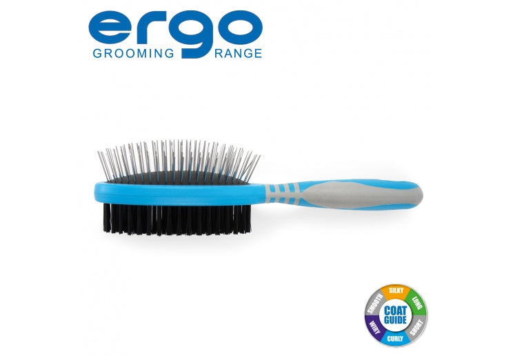 Introducing the Ergo Double-Sided Pin and Bristle Brush, a must-have tool from the Ergo Grooming Range. Featuring both pins and bristles, this brush is perfect for detangling and smoothing your pet's fur. Its blue design adds a touch of style to your grooming routine.