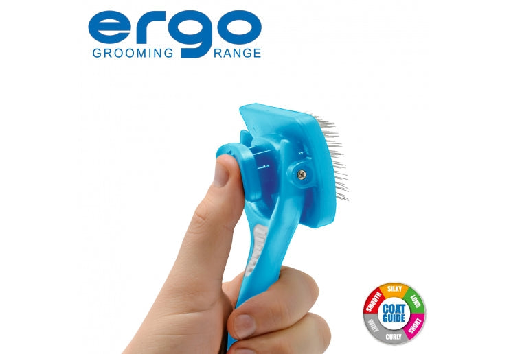 The Ergo Self Clean Slicker Brush, part of the Ergo Grooming Range, features a unique design that allows for easy removal of caught hair. With a simple push forward, the slicker's head clears away all the tangles and debris, making grooming a breeze. Say goodbye to frequent brush cleanings and hello to a cleaner, healthier coat for your pet.