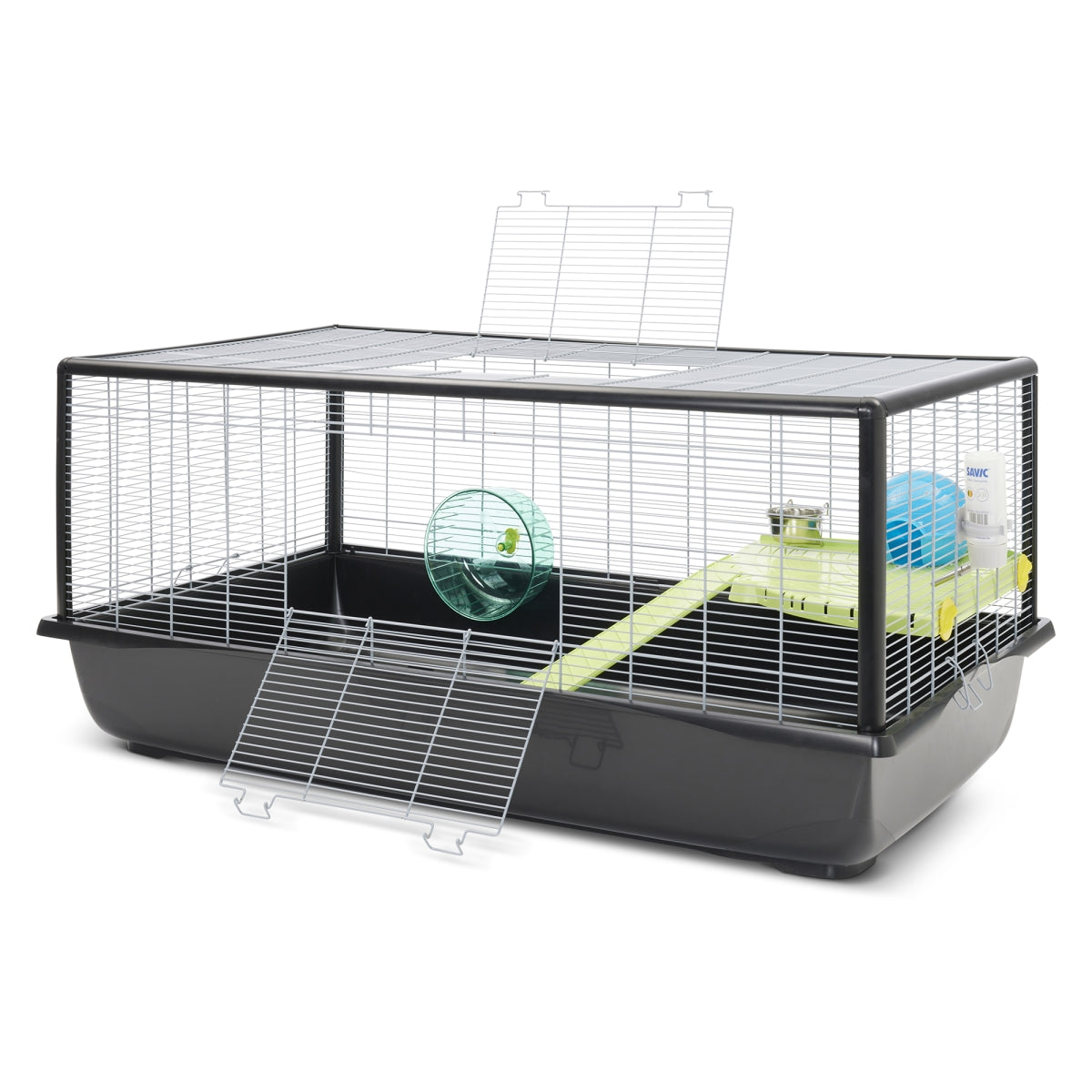 This cage features a large front door that simplifies daily cleaning and interaction with your pet. Assembly is straightforward, requiring no tools, and the cage’s collapsible design allows for easy storage when not in use. A running wheel and drinking bottle are also included, ensuring your pet remains active and hydrated. Moreover, the cage base is crafted from recycled plastic, reflecting our commitment to environmental sustainability.