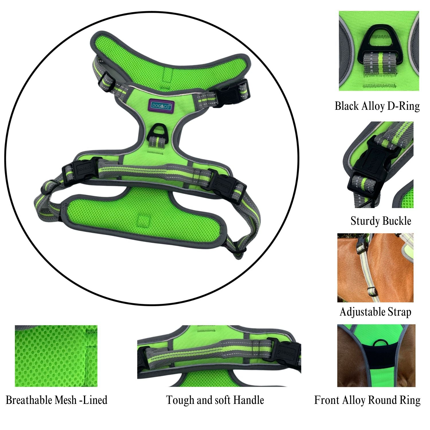 The dog harnesses are fully adjustable with two easy clip buckles on the chest and one on the neck strap. There are 2 connecting points, one on the back pad and one located on the chest pad; this allows for a choice of lead control or dual control with the use of a training lead.