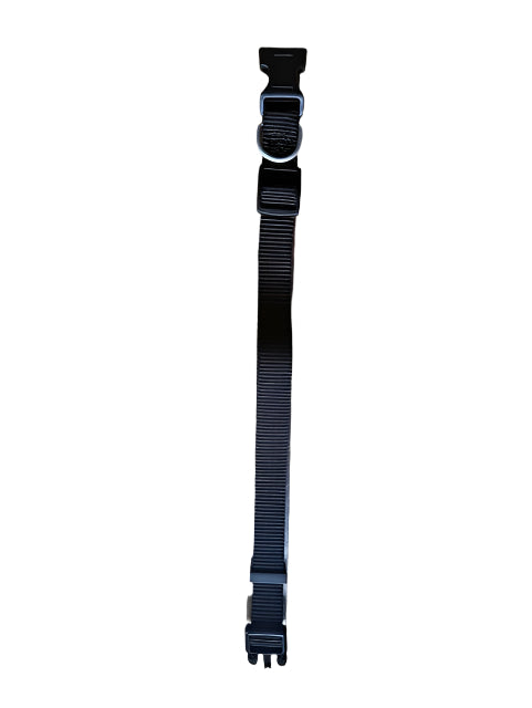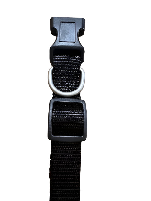 This nylon, black dog collar features a strong plastic clip and a D ring.