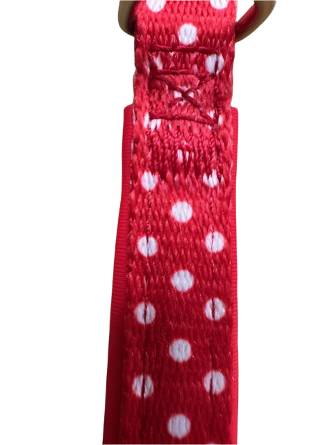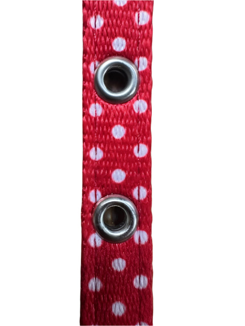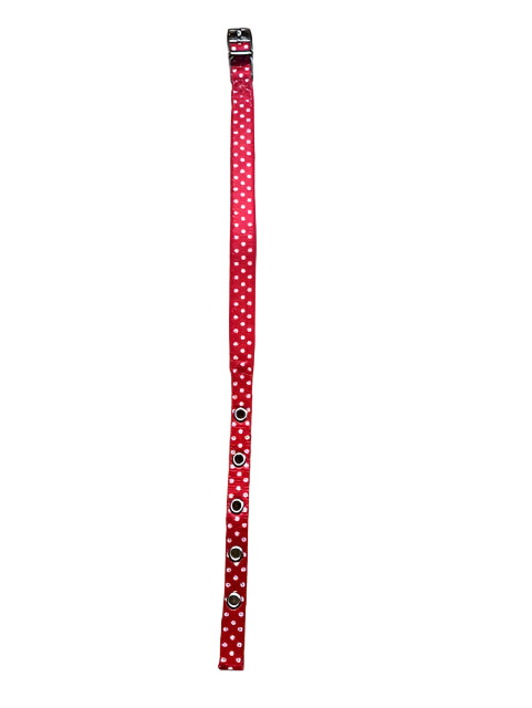 This red and white polka dot dog collar features a metal buckle with 5 metal-rimmed holes; to adjust to a perfect size. The collar is made from nylon and is padded at the back for added comfort.