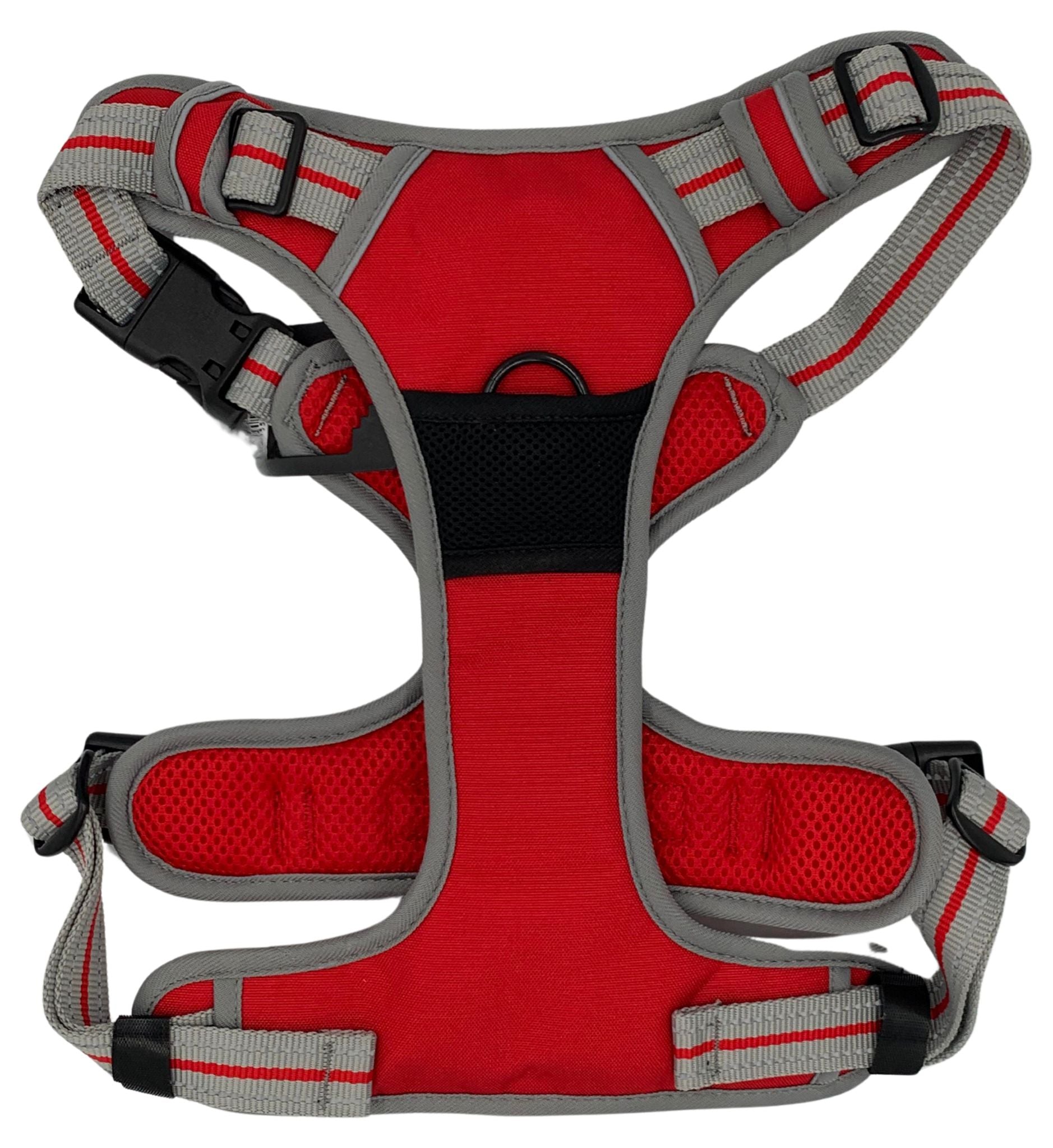 The dog harnesses are fully adjustable with two easy clip buckles on the chest and one on the neck strap. There are 2 connecting points, one on the back pad and one located on the chest pad; this allows for a choice of lead control or dual control with the use of a training lead.
