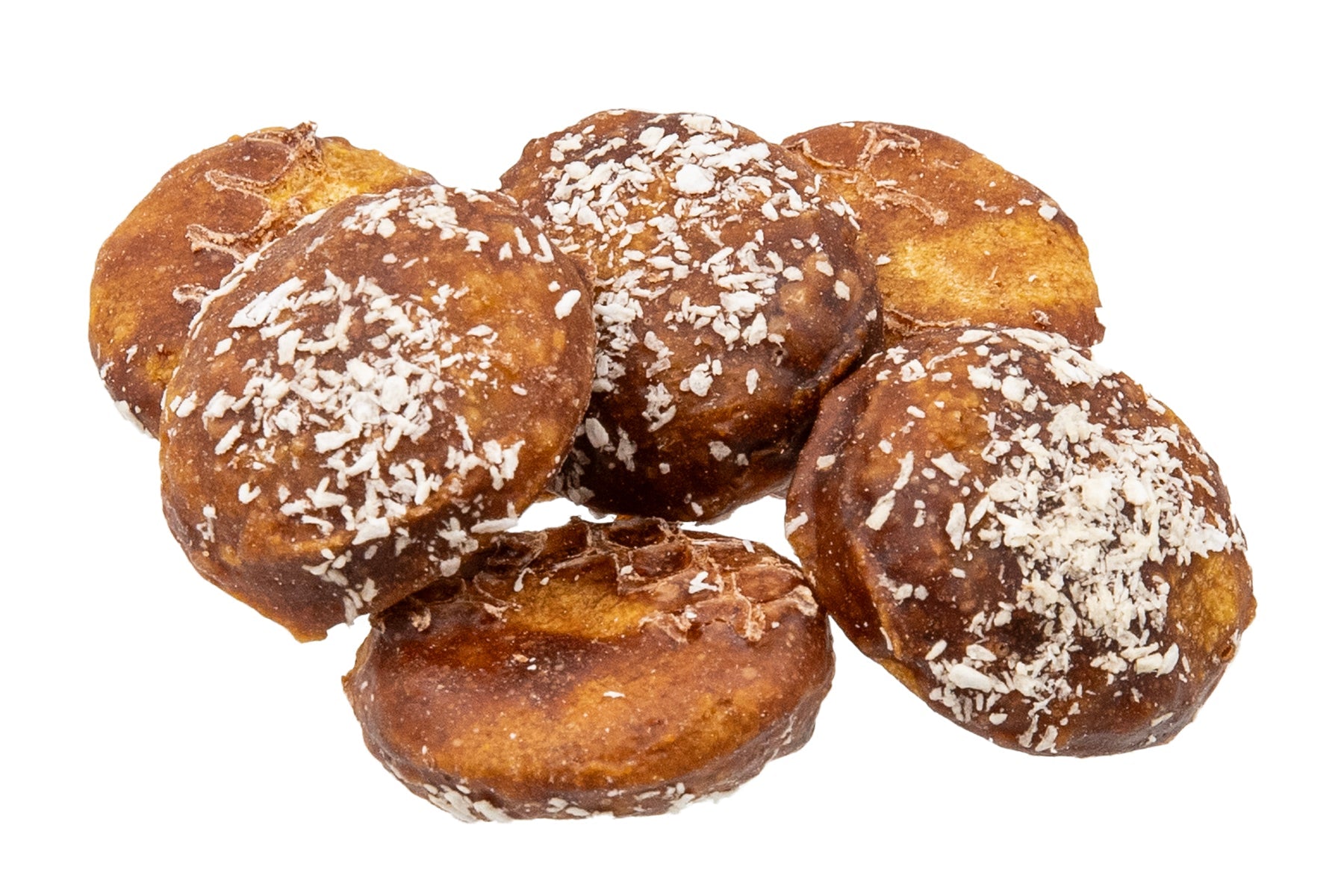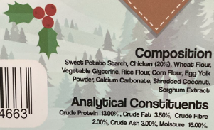 Composition: Sweet Potato Starch, Chicken (20%), Wheat Flour, Vegetable Glycerine, Rice Flour, Corn Flour, Egg Yolk Powder, Calcium Carbonate, Shredded Coconut, Sorghum Extract